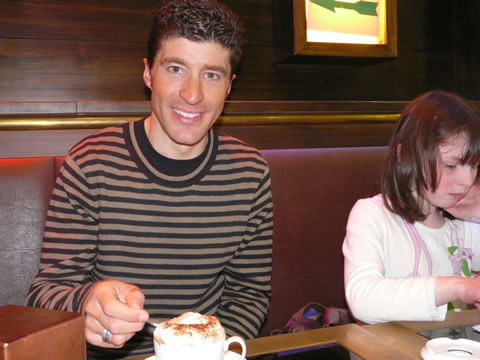 While enjoying his dessert, Chechu told us that during a race, when all the riders meet at the breakfast table, the team doctor is adamant that they should only eat low calorie fat-free cereals. But as Chechu and some of his team mates have a sweet tooth, as soon as the doctor turns his back, they all stuff themselves with Nutela. The funny thing is that Roger and I witnessed this fact once when we were staying at the same hotel as the Discovery team in Belgium, during the 2006 Giro, eating breakfast next to the riders’ table.