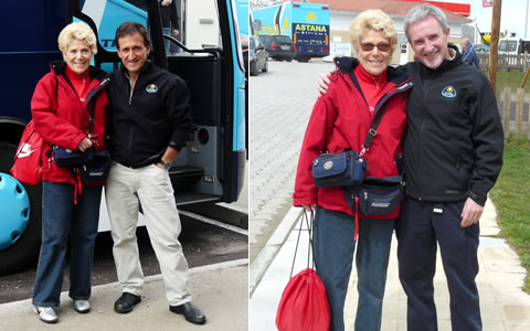 Our timing was perfect because we arrived precisely with the Astana support team group and buses, and spotted our friend, soigneur Valentin, with a new hairstyle, which makes him look very young.