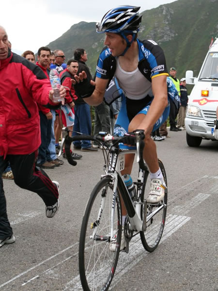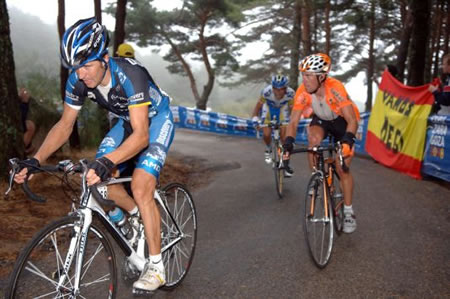 Chechu and his team-mates shepherded Devolder to the base of the final climb to the ski station at Cerler. The average gradient for the final climb ws 5.5%, with a maximum of 9.5%. Not the steepest climb, but relentless and it proved a tough day for Discovery.